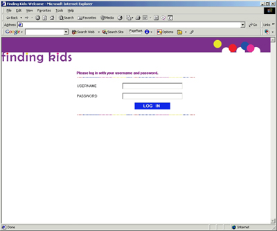 Finding Kids. 2005. Focus on functionality, not design, due to short timeframe for deliverable. This also was built with login screen. The idea was to connect 6 different Oracle databases for social services organizations in the County and using JSP/JDBC/SQL to search the records and find what programs the children had been through in order to try to reduce the number of child deaths within the system. This functioning prototype was created within a few short weeks, including all of the back-end code. The project was a success and users found this combined interface easier to use than their single database. The user data entered was matched against a database. Any error messages were displayed on this screen. A session was used to keep track of the user throughout the visit. If one typed in a url directly, it checked to see if the user was actually logged in and, if not, routed the user back to this login page.